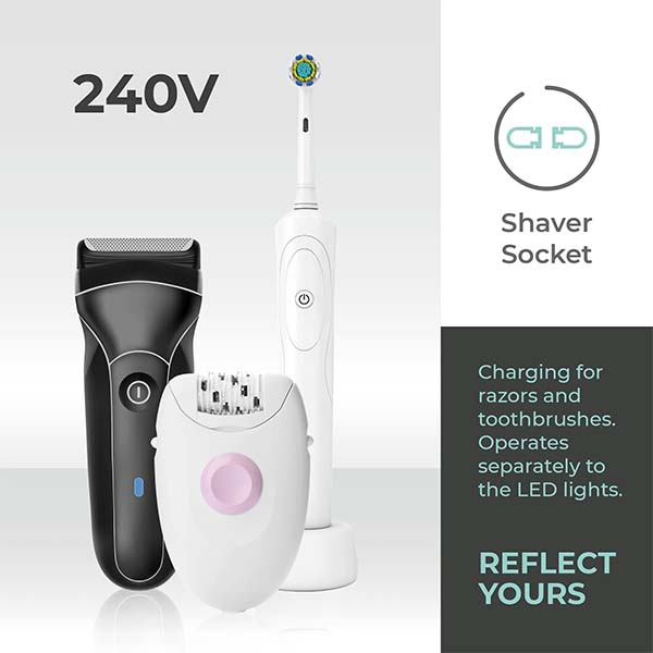 A standout feature of the LIBRA mirror is its built-in shaver socket. Discreetly integrated into the design, the shaver socket offers a convenient solution for keeping your electric shavers and toothbrushes charged and ready for use. This clever addition helps keep your bathroom countertop tidy and your grooming tools within easy reach.
