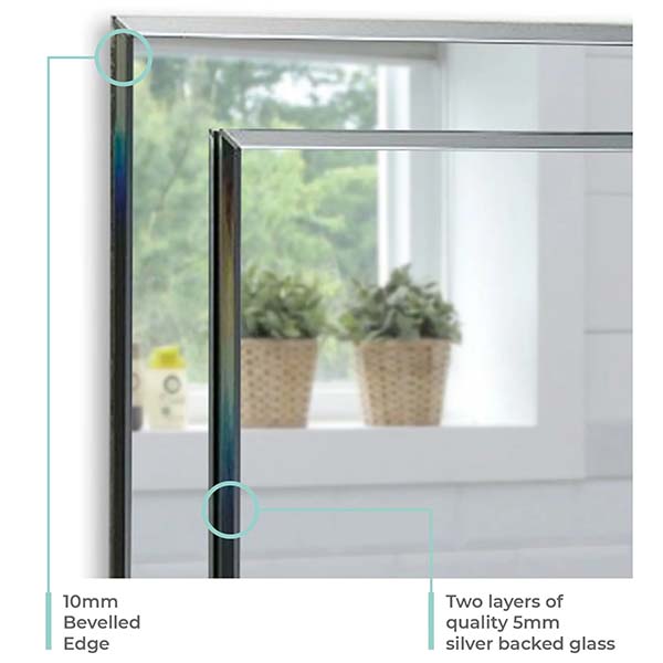The LYNNE Rectangular Bathroom Mirror boasts a stunning double-layer design, meticulously crafted with two layers of high-quality 5mm silver-backed glass. This construction ensures not only remarkable durability but also enhances the clarity of your reflection, providing a flawless mirror image every time. The silver backing is renowned for its superior reflective qualities and exceptional resistance to the damp and humid conditions typical of bathrooms, making it an ideal choice for any setting.