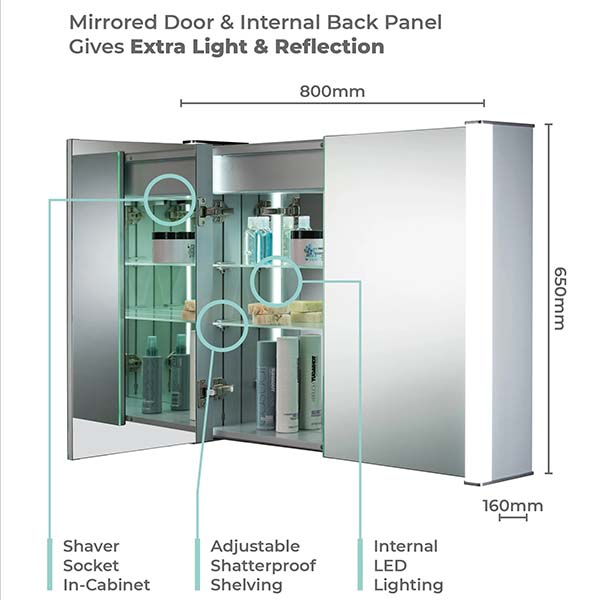 - WIRE FREE Demister Pad is concealed inside the Double Sided Mirror Door